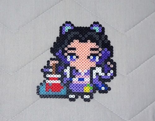 こんにちは、「たこやき。」です。 「鬼滅の刃」より、胡蝶 しのぶ【夏祭りVer.】です。 新シリーズの夏祭りバージョン第7弾、 ビーズはパーラービーズを使用しています。今回のイメージは、「金魚をGETして喜ぶしのぶちゃん」だそうです。