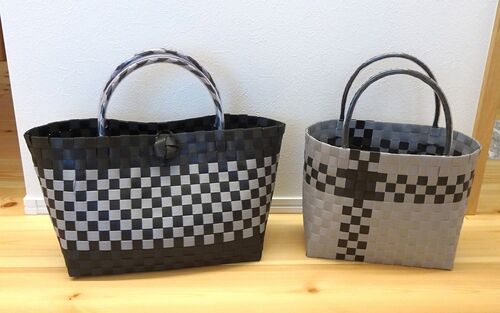 こんにちは、「たこやき。」です。 ずいぶんと久しぶりの更新です。 今回作った作品は、PPバンドのバッグです。 左が妻が製作したもの、右の少し小さめのほうがたこやき。が製作したものです。