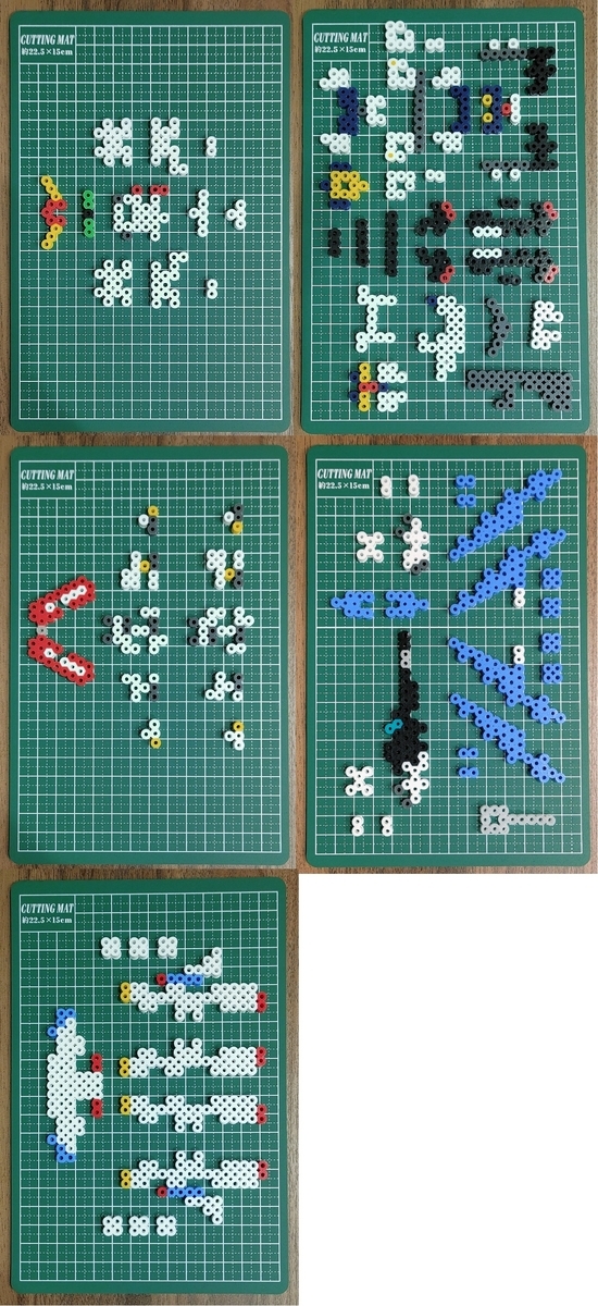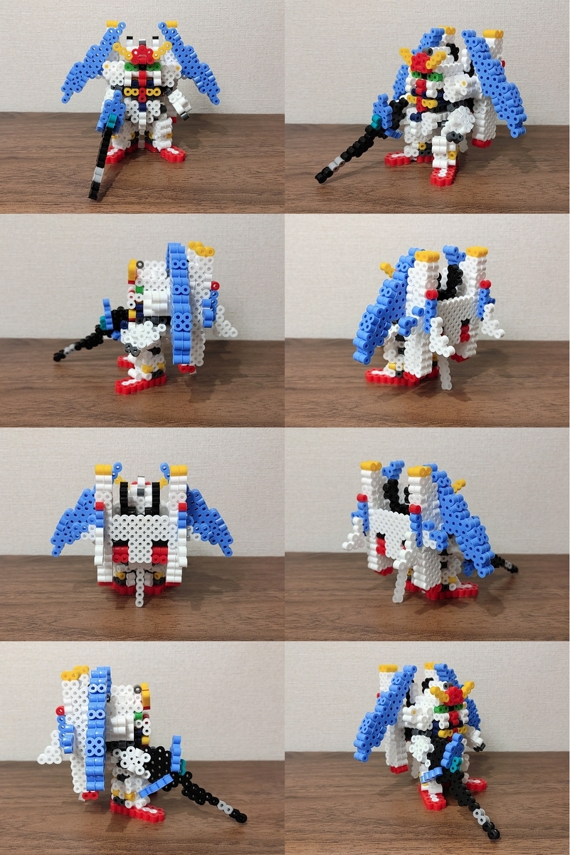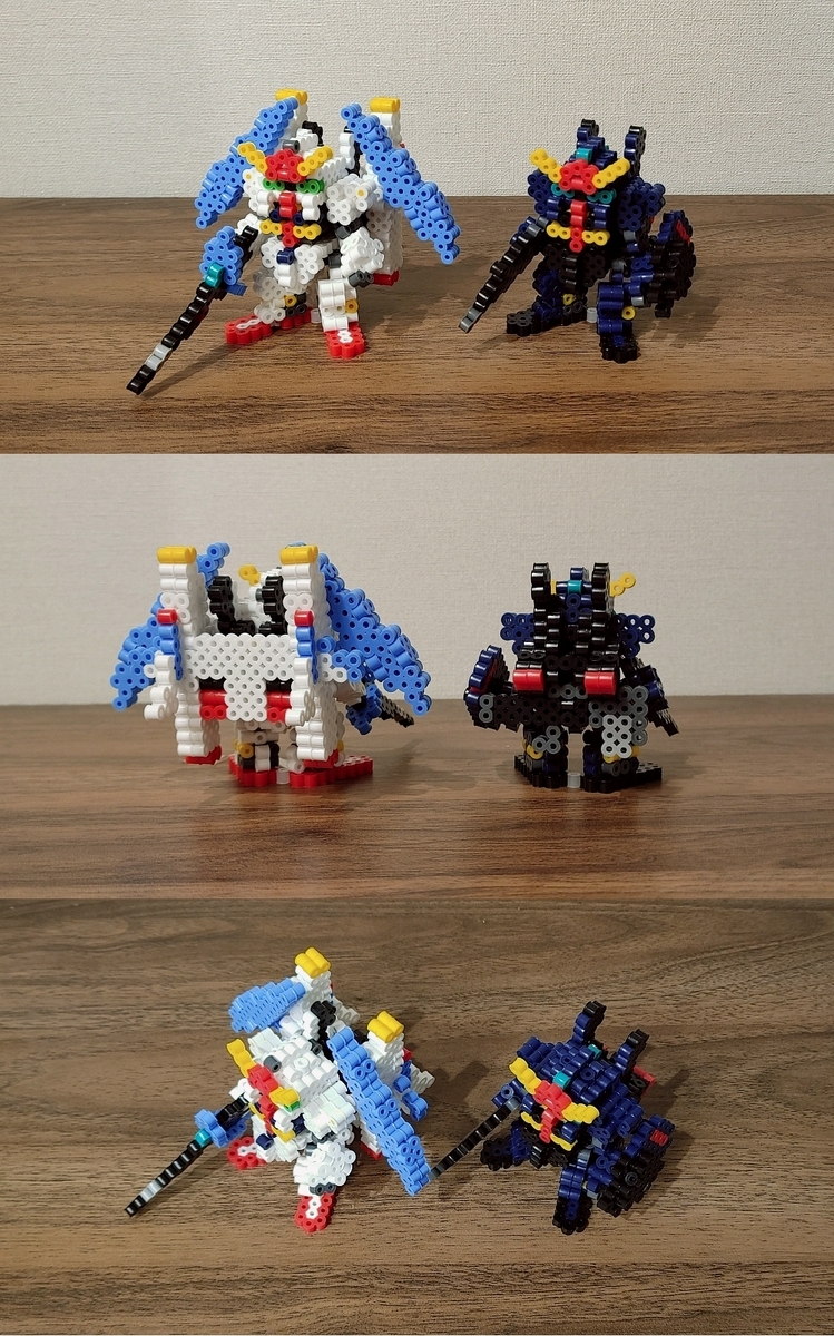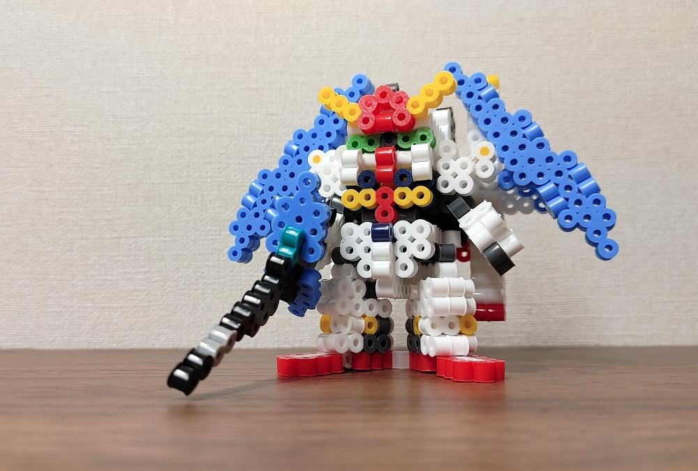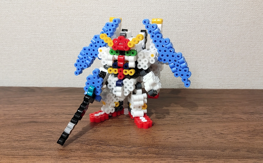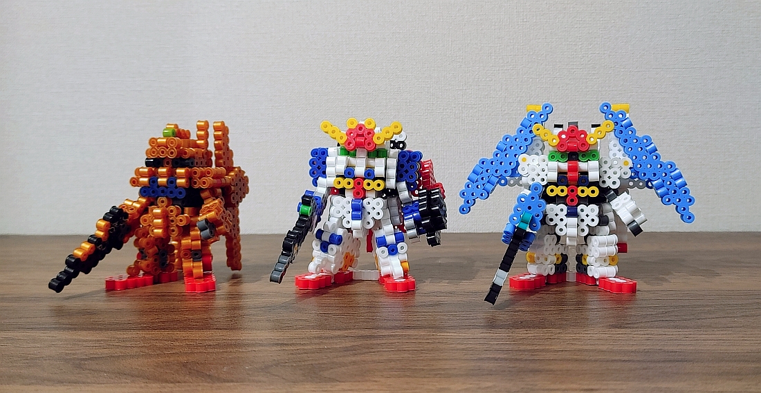 いつもどおり「3DPerlerBeads お手軽頑固な立体アイロンビーズ」というサイトを参考に、エゥーゴカラーに変更して作製した「ガンダムMk-II」と、「Gディフェンサー」部分を作成しています。ビーズは「カワダ パーラービーズ」をメインに、「カワダ ナノビーズ」を一部使用しています。